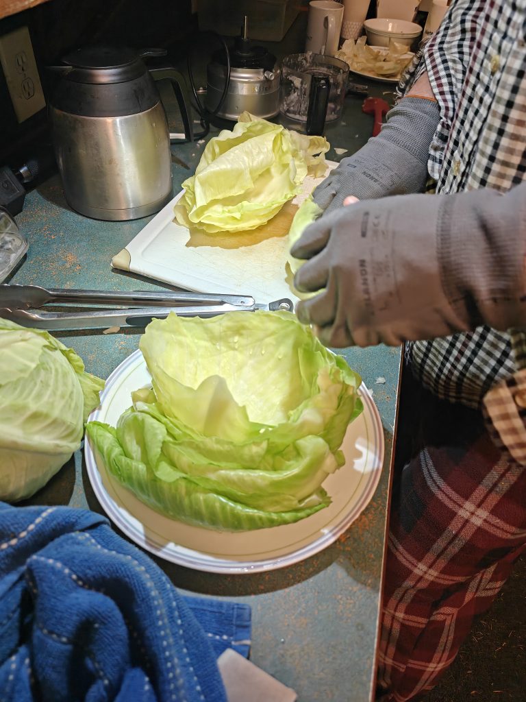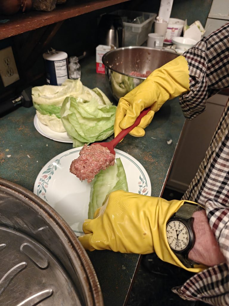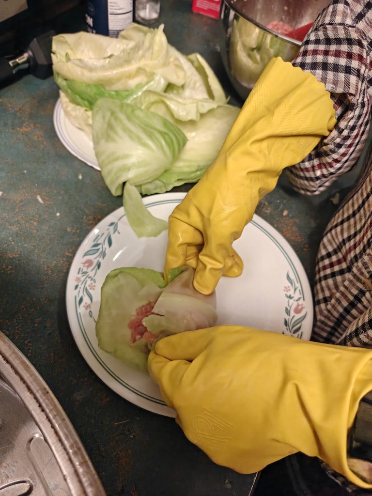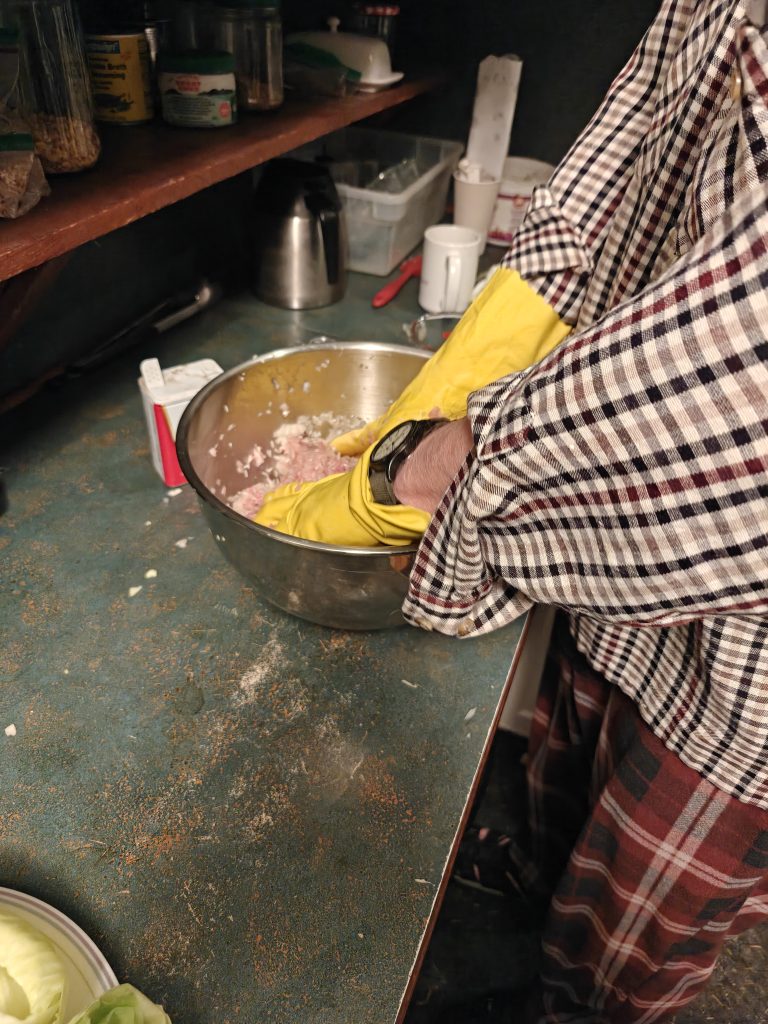 Chop up the onions and any leftover cabbage into small bits. Mix them with the uncooked rice, spices and meat in a large mixing bowl. Beat the eggs separately in a small bowl until they are a solid yellow. Mix them into the rice/meat mixture until everything is incorporated. Steve mixes with his hands wearing rubber gloves.