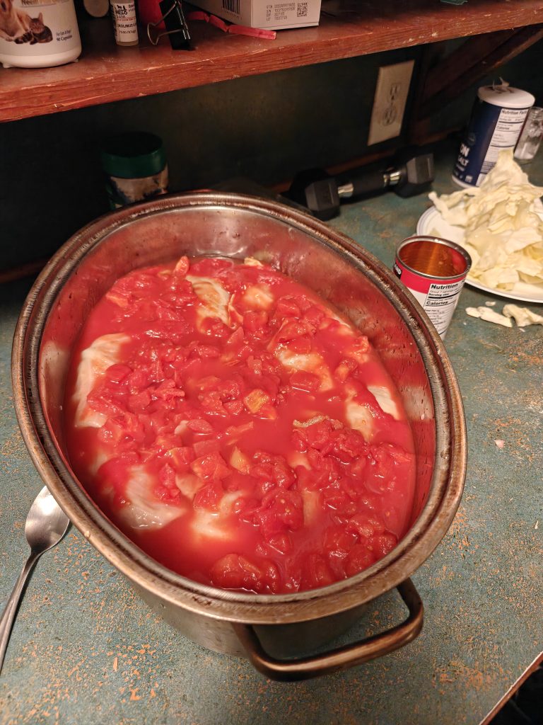 Prepare a large deep baking dish with a cover. Flatten out a hot wet cabbage leaf and put a big portion of filling in. Starting from the stem, fold the edges over and roll it up like a burrito. Put it in the oven dish. Keep going until all the cabbage leaves are filled. Pour the tomatoes and water over the cabbage rolls to cover them. It needs to be enough liquid to cook the rice.